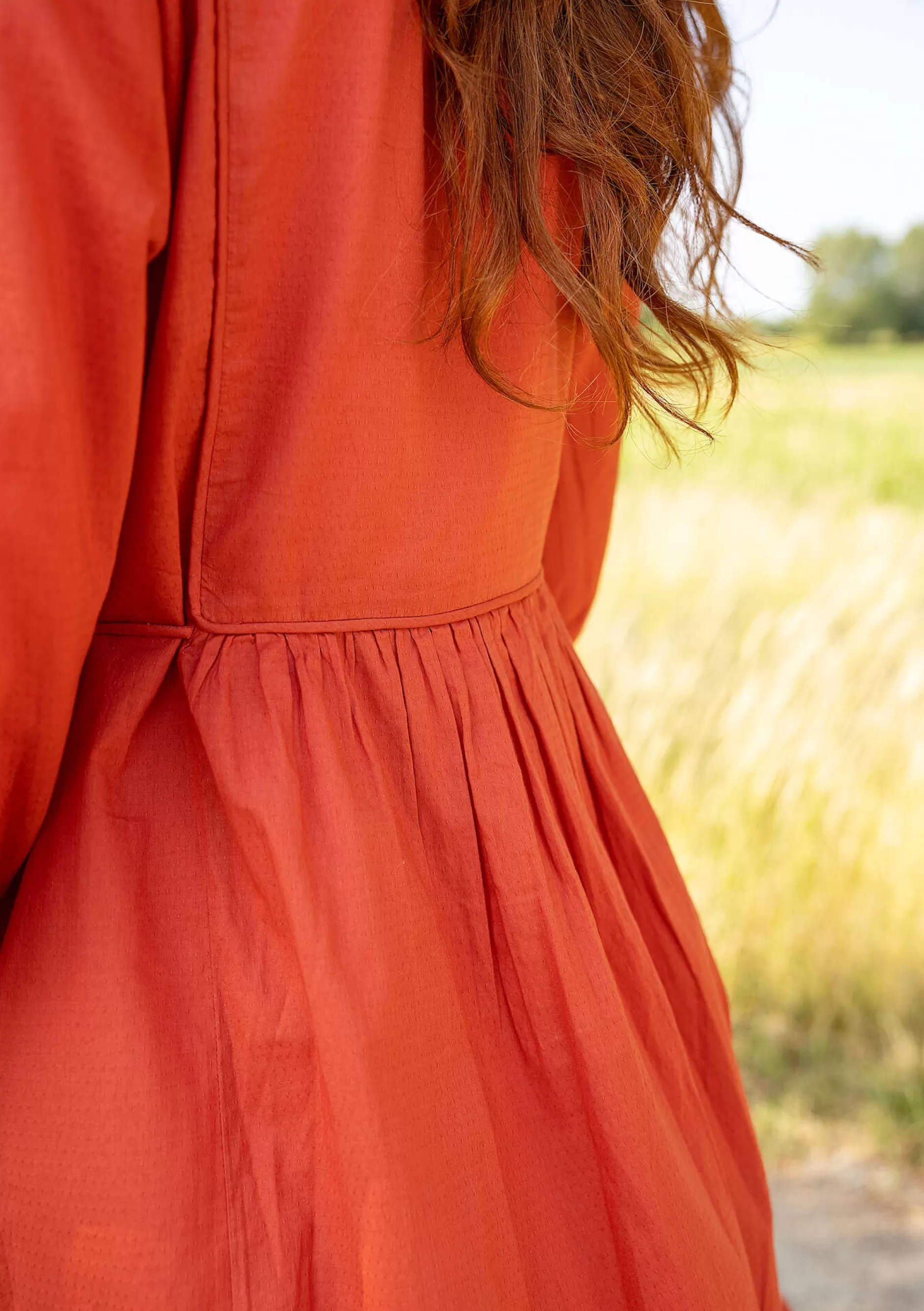 ziegel S,M,L,XL,XXL,XS|Kleid aus strukturiertem Dobby. In mehreren Partien genähtes Modell mit Volantsaum und 3/4-Ärmeln. Bestickte Passe oben. Seitliche Bindebänder mit Troddeln.||
