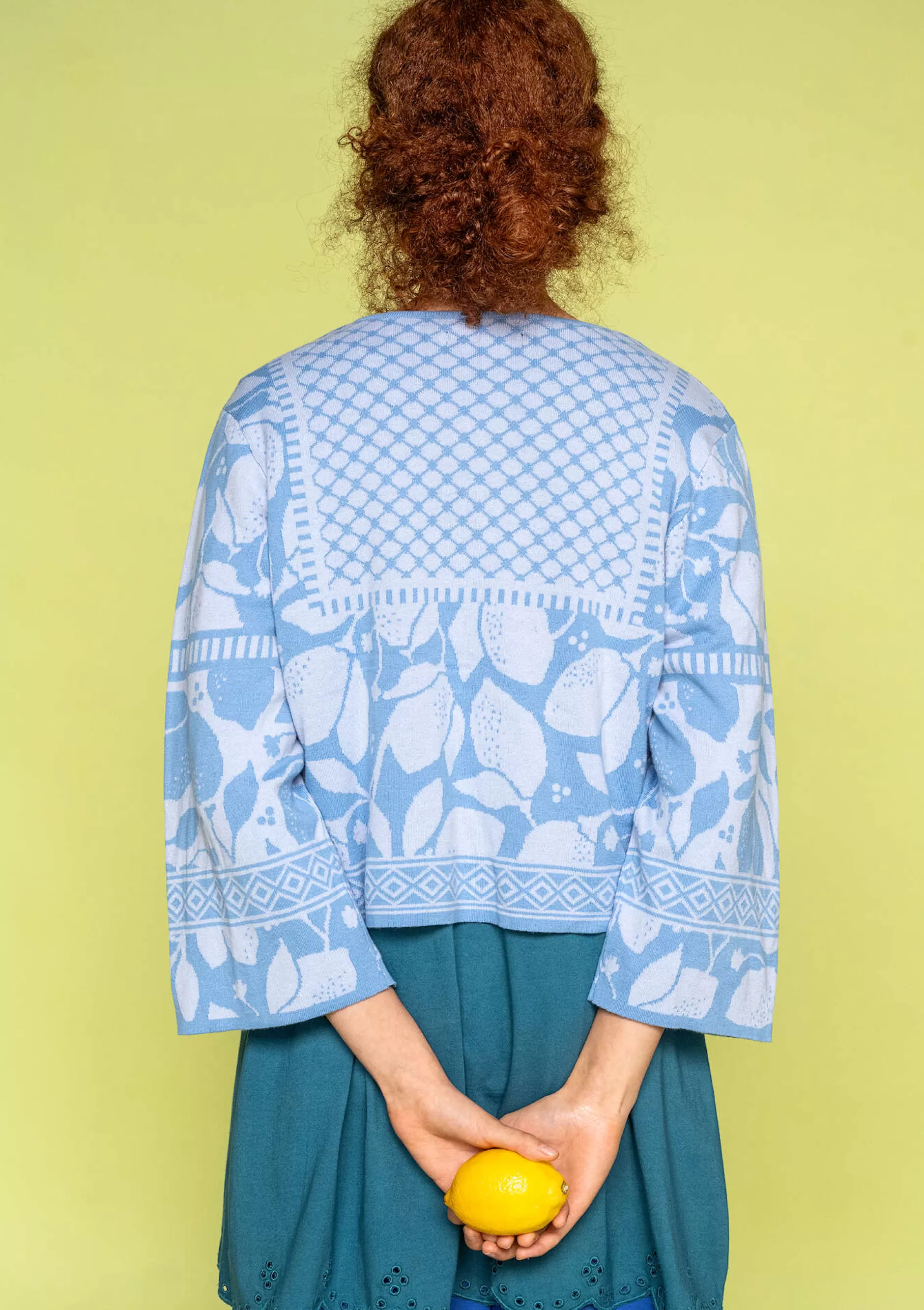 mildes blau S,M,L,XL|Etwas kürzere Strickjacke mit 3/4-Ärmeln, Jacquard-Zitronendessin und grafisch gemusterter Passe. Runder Ausschnitt und hübsch verzierte Metallknöpfe.||