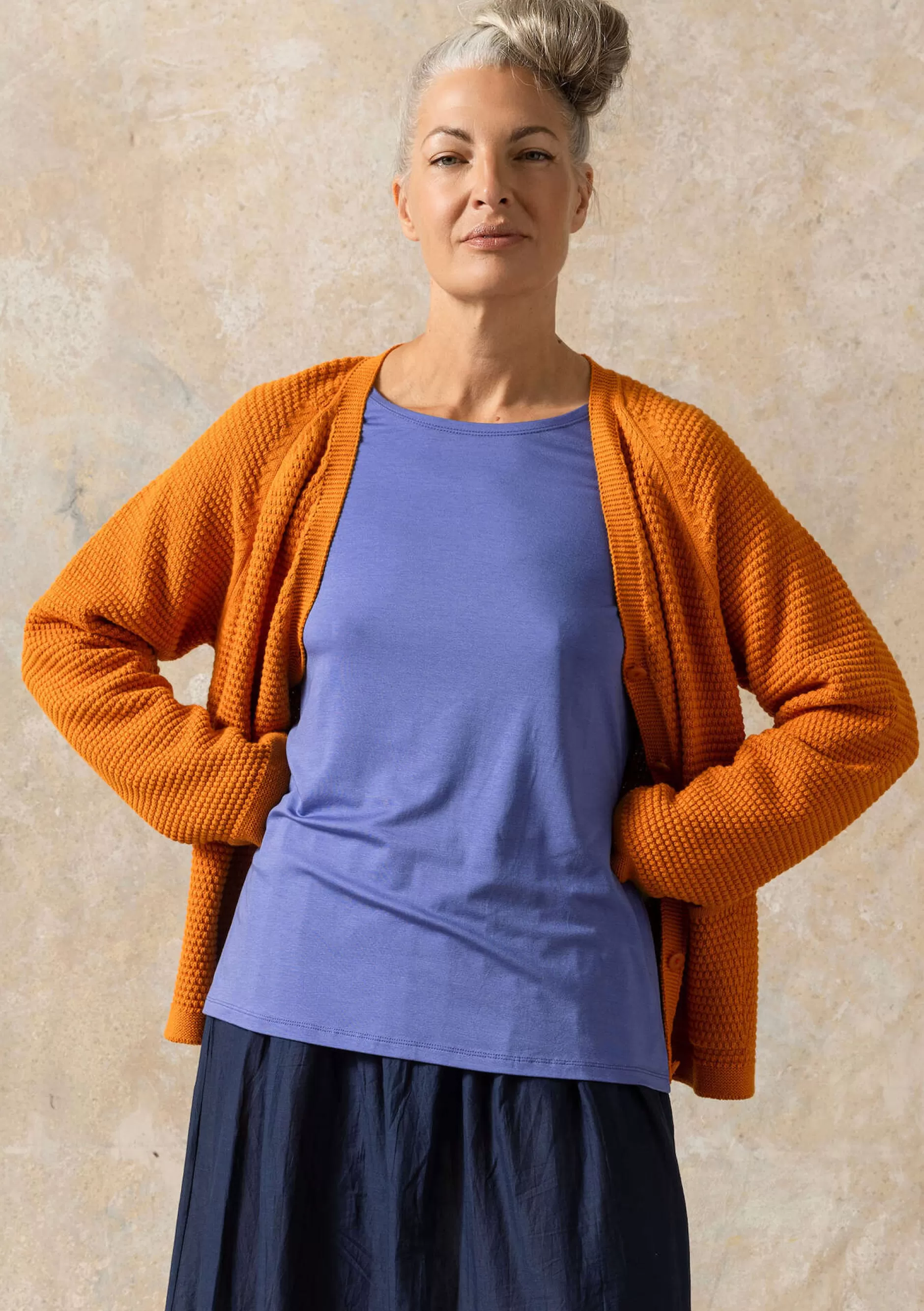 100 % Recycling-Baumwolle. Für die zertifizierte Recycling-Baumwolle werden Reste aus der Textilproduktion verwertet, farblich sortiert und zu neuen Fasern versponnen. Durch die Verwendung wiederaufbereiteter Materialien reduzieren wir unsere Klimaauswirkungen. Das Färbeverfahren ist ökologisch zertifiziert. Feinwäsche bei 40 °C. Feucht in Form ziehen und liegend trocknen. Liegend aufbewahren. Läuft 1–2 % ein. Fertigung in Casablanca, Marokko.
