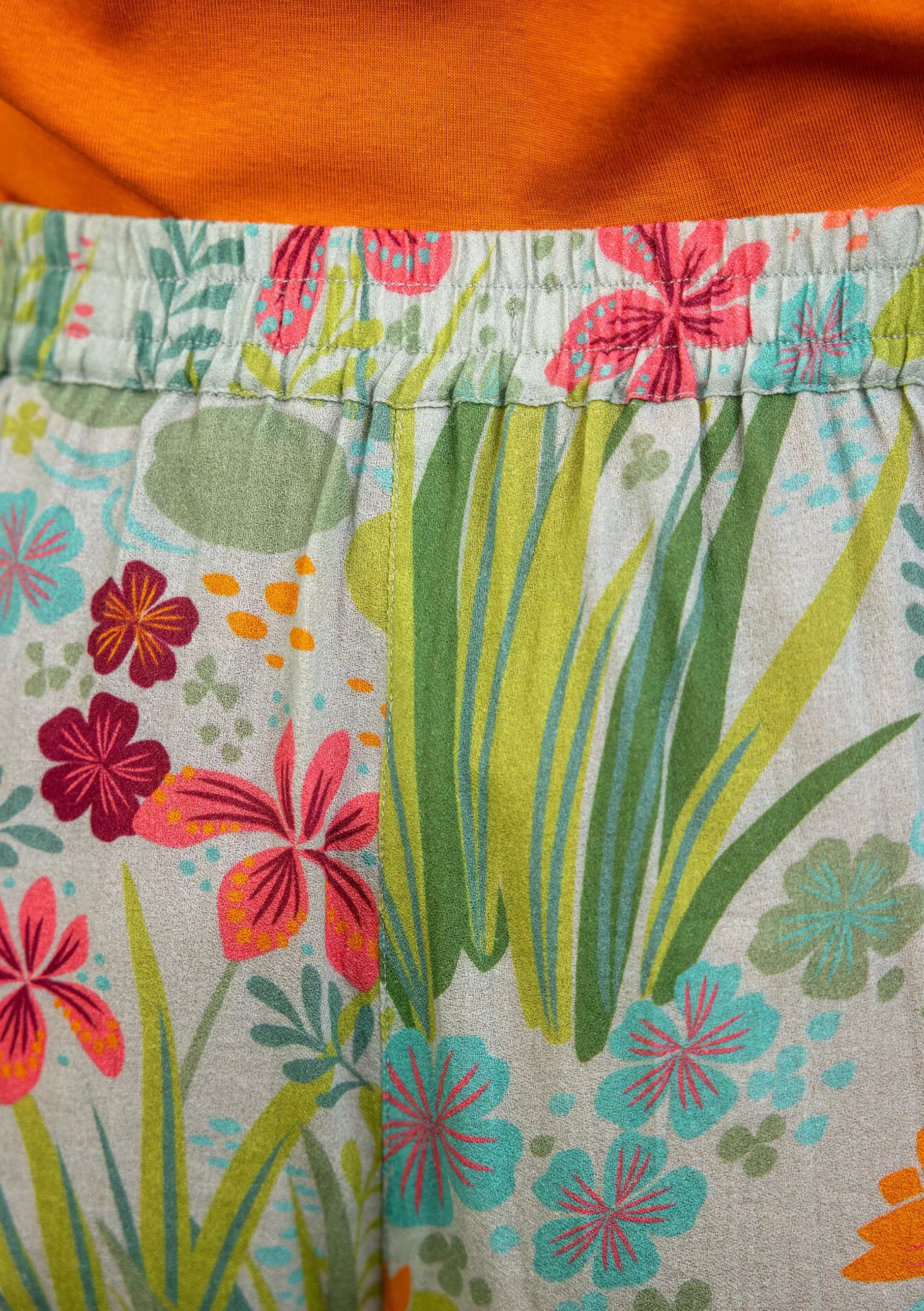 minze S,M,L,XL|Weite Hose bzw. Hosenrock in 3/4-Länge, mit digital gedrucktem Muster. Bund mit breitem innen liegenden Gummizug hinten sowie Tunnelzug mit Bindebändern vorne.||