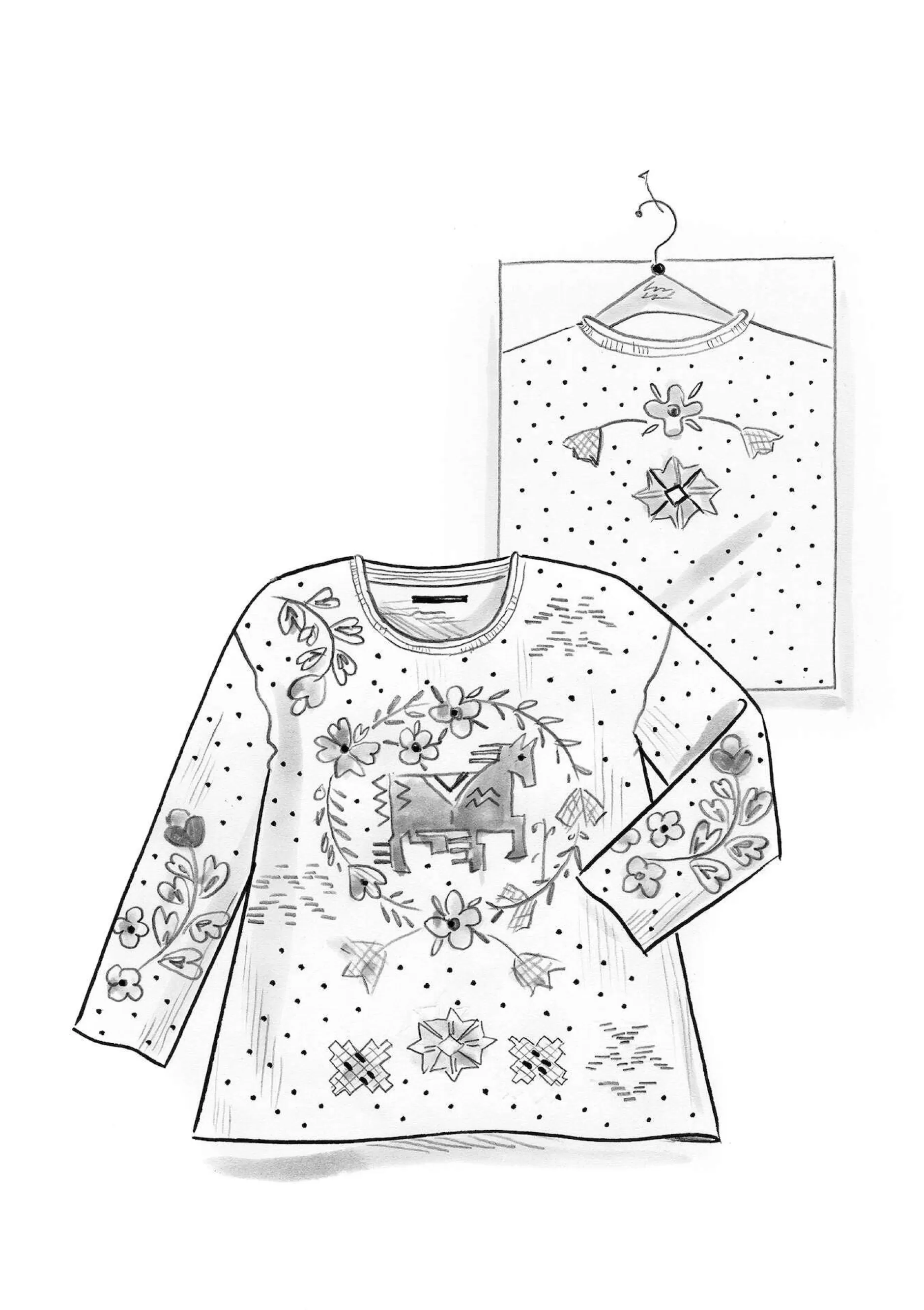 achatrot S,M,L,XL,XXL|Gerade geschnittener Jacquardstrickpullover mit überschnittenen Schultern und 3/4-Ärmeln. Motivbilder auf Vorder- und Rückenteil sowie den Ärmeln rücken das Wildpferd „Feru“ in den Fokus. ||