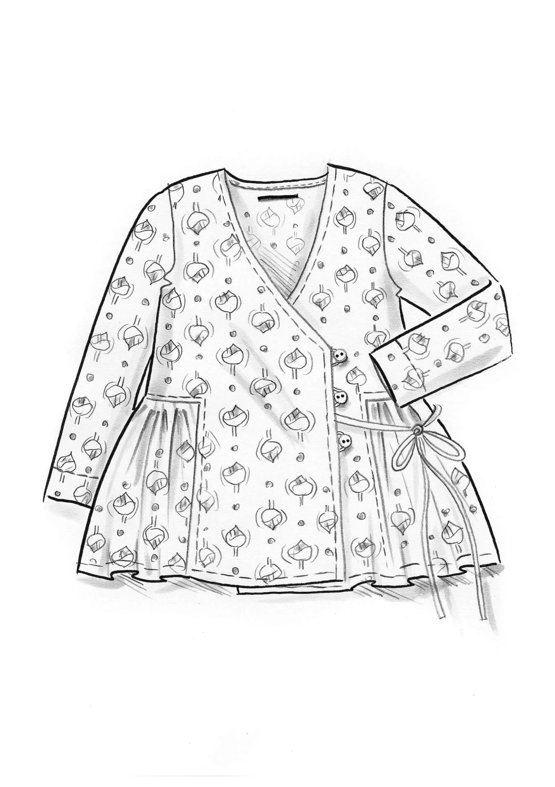 achatrot S,M,L,XL|Digital bedruckte Wickelbluse in zwei Musterbildern, die sich je nach Farbstellung unterschiedlich zeigen. Modell mit V-Ausschnitt, Bindebändern und bezogenen Knöpfen. Lange Ärmel und mittig angeordnete Taschen. Seitlich angekräuselte Teilungsnaht unter der Brust. ||