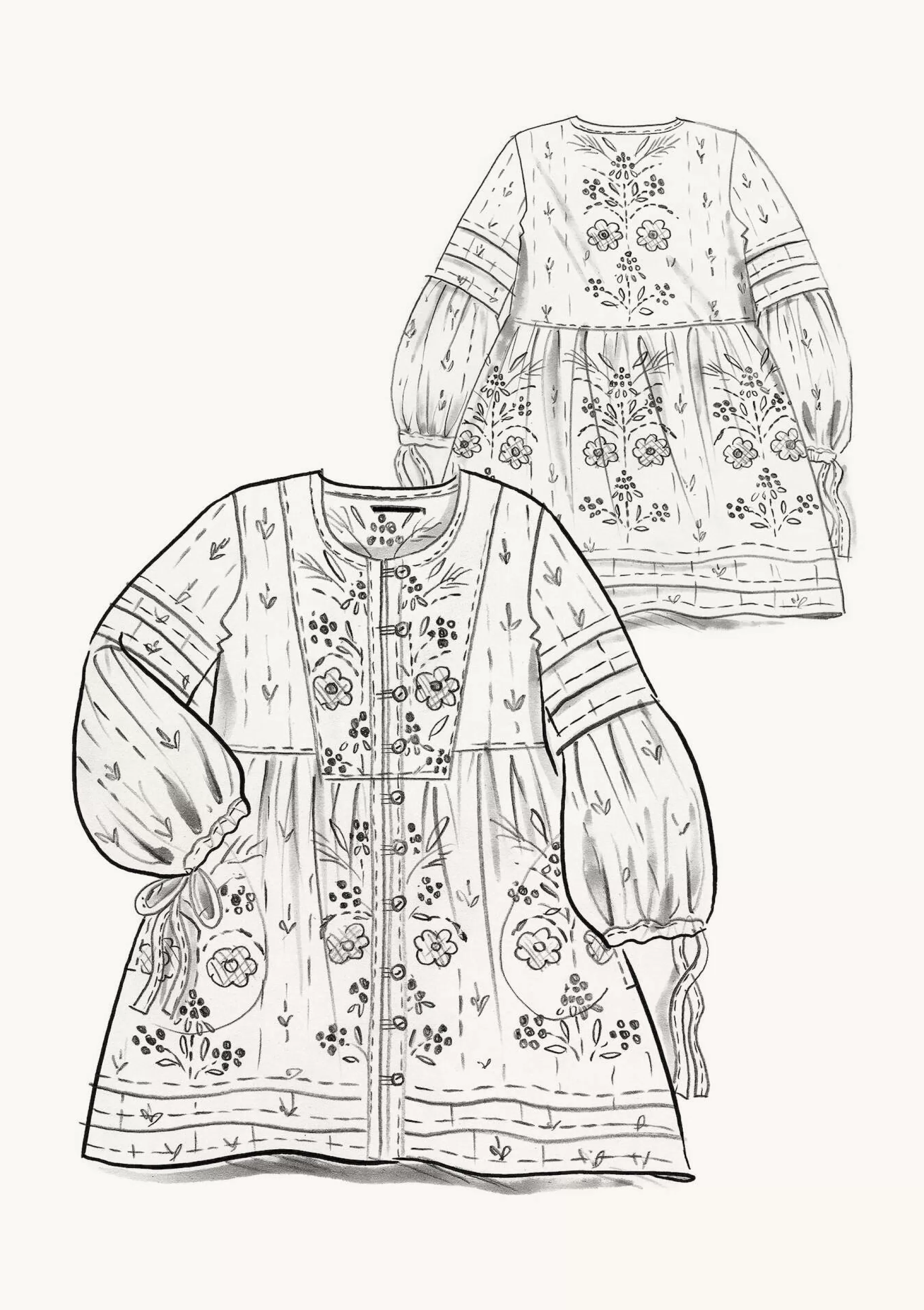 aschgrau XS,S,M,L,XL,XXL|Bedruckte Tunika mit durchgehender Knopfleiste und Seitentaschen. Teilungsnaht in der Taille und Passe vorne. Biesen an Saum und Ärmelabschlüssen. Stickereien vorne und hinten. Runder Ausschnitt und pludrige Ärmel mit Bindebändern an den Abschlüssen. Knopfleiste mit Stoffösen und Perlmuttknöpfen.||