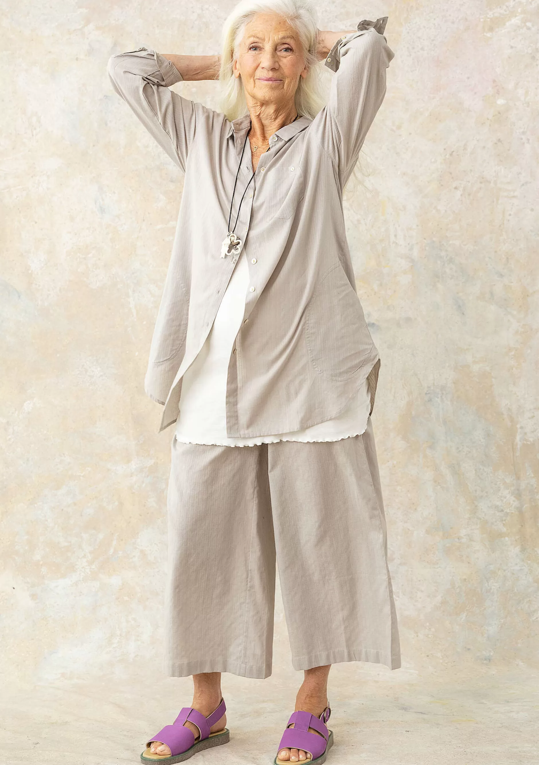 hellgrau S,M,L,XL|Einfarbige, längere Oversized-Hemdbluse. Schönes Gewebe mit Dobby-Streifen. Lange Ärmel, hübscher Hemdkragen und gefärbte Perlmuttknöpfe. Seitliche Taschen.||